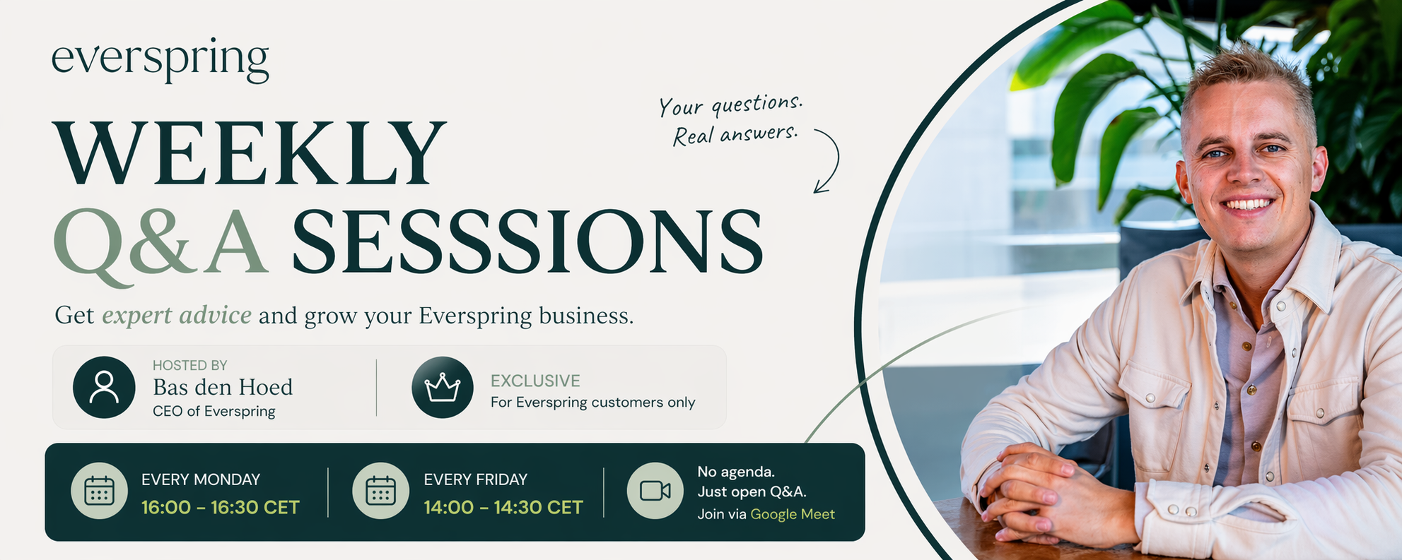 A dedicated moment to bring your questions to the Everspring team and connect with fellow resellers across Europe. Every Monday and Friday — no agenda, you set the topics.